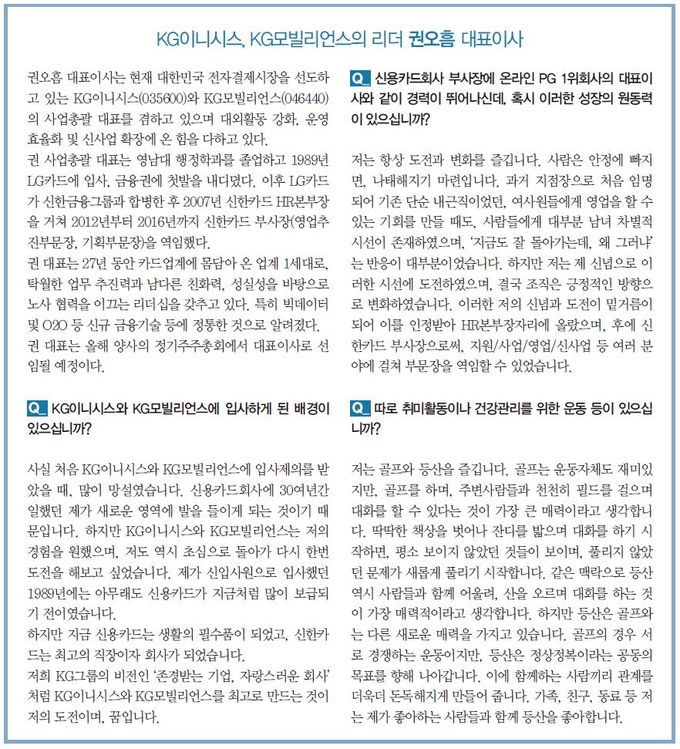 한국의 전자결제시장은 여러 간편결제 수단들의 등장으로 핫이슈가 되고 있다. 전자결제시장 중 휴대폰결제 부문에서 17년 간 1위를 달리고 있는 KG이니시스와 KG모빌리언스의 권오흠 대표를 만났다.