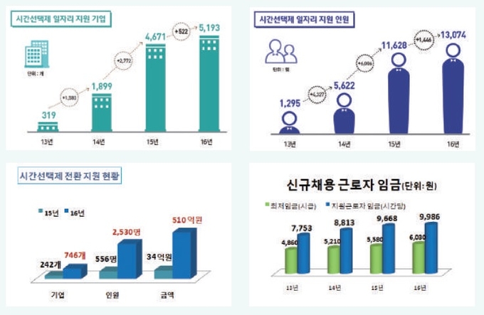 고용노동부 보도자료에 따르면 지난 4년 간 시간선택제 일자리를 활용하는 기업이 대폭 증가했으며 양적 성장은 물론, 업종 다양화, 임금수준 상승 등 질적으로도 발전하고 있는 것으로 분석됐다. 시간선택제 일자리 지원기업은 16배(2013년 319개 → 2016년 5,193개), 지원인원은 10배(2013년 1,295명 → 2016년 13,074명), 지원금액은 15배(2013년 34억원 → 2016년 510억원) 증가했다.