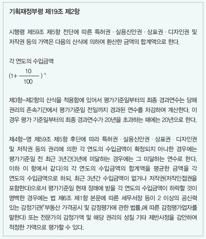이 경우 각 연도의 수입금액이 확정되지 아니한 것은 평가기준일 전 3년간의 각 연도 수입금액의 합계액을 기획재정부령이 정하는 바에 따라 평균한 금액을 각 연도의 수입금액으로 할 수 있다”라고 규정하고 있는 바, 특허권이 사용되었거나 사용될 개연성이 있는 경우에는 다음과 같이 기획재정부령 제19조에 따라 가액을 정하도록 되어 있다.