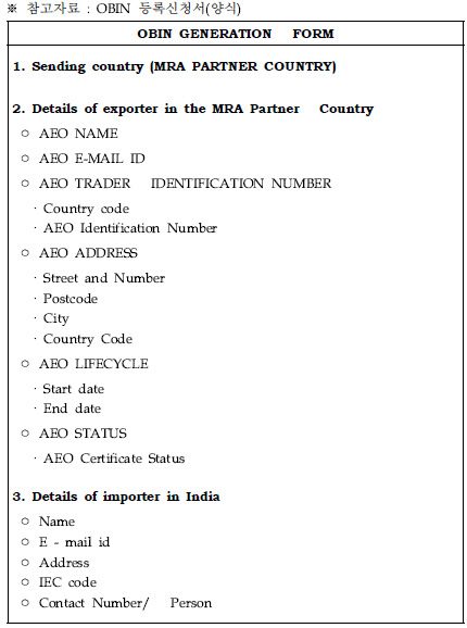 관세청은 또 수출기업이 이런 혜택을 받기 위해서는 인도 관세청이 외국의 AEO 수출기업에게만 발급해 주는 해외거래처부호(OBIN, Overseas Business Identification Number)를 사전에 발급받아 인도세관 수입신고서에 반드시 기재해야 한다고 밝혔다.