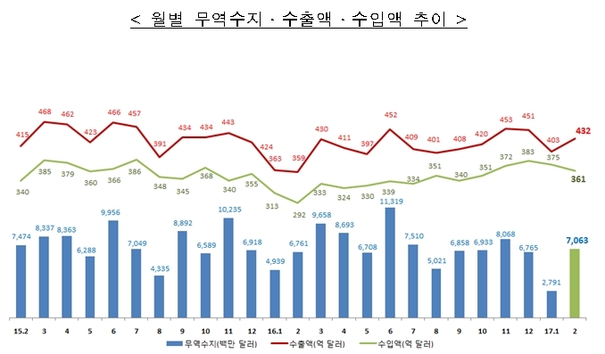(조세금융신문=신경철 기자) 관세청은 ‘2월 수출입현황’ 발표를 통해 지난달 무역수지 흑자액이 71억 달러를 기록했다고 15일 밝혔다. 무역수지 흑자는 2012년 2월 이후 61개월째 이어가고 있다.