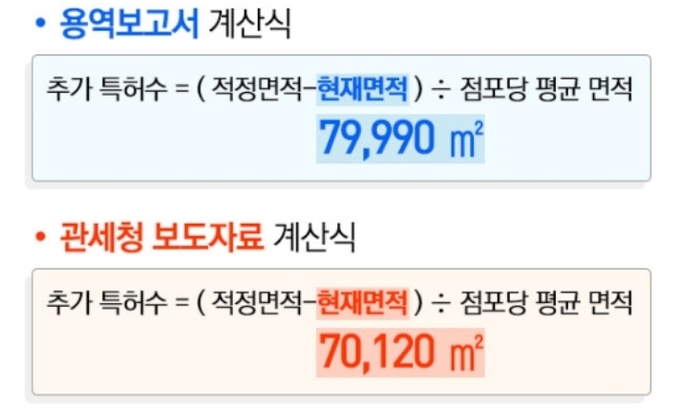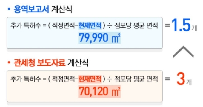 용역보고서 계산식에 들어갈 현재면적은 지난해 특허가 발급된 면세점 9곳의 실제면적이 들어가야 하지만 관세청은 당시 기준으로 특허가 발급된 신세계와 두산 면세점 2곳의 면적을 빠뜨리고 이미 특허가 취소된 롯데와 SK면세점을 넣었다.
