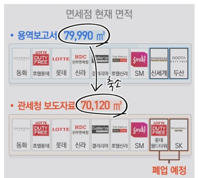 폐업 예정이던 롯데와 SK면세점의 영업장 면적은 합산이 누락된 신세계와 두산 면세점보다 더 좁다. 결과적으로 면적이 넓은 신규 면세점 2곳이 빠지고 면적이 좁은 폐업 면세점 2곳이 들어갔다.