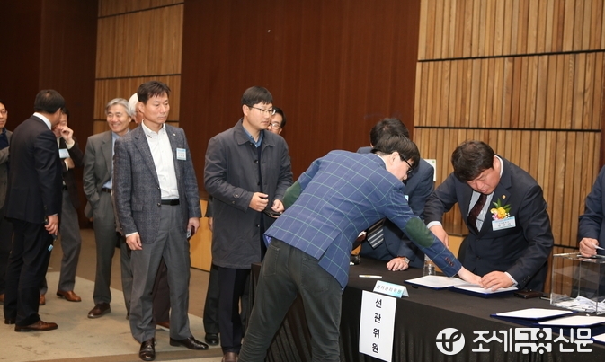 (조세금융신문=신경철 기자) 3월 21일 여의도 63빌딩 2층 그랜드볼룸에서 열린 전국종합주류도매업협회중앙회 정기총회에서 제7대 회장 선출을 위해 대의원들이 신분확인을 받고 있다.