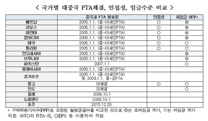 이어 "제3국 진출형 신규 투자의 경우 임금 수준과 지리적 거리 등 생산비용이 중요한 요인"이라며 "중국 주변국과 자유무역협정(FTA)을 체결하거나 개정할 때 관세 인하·규제 개선 등을 요구해 생산비용을 낮출 필요가 있다"고 밝혔다.
