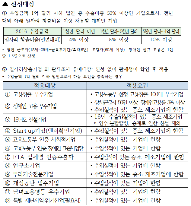 관세청은 수입금액 1억 달러 이하인 업체 중 수출비중이 50% 이상인 기업으로서, 전년 대비 일정비율 이상 채용 계획이 있는 기업에 대해 관세조사 유예 신청을 받는다고 4일 밝혔다.
