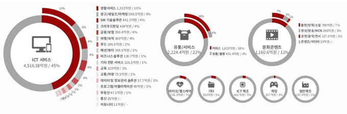 지난해 한국 스타트업에 투자된 돈은 모두 1조78억원이었다. 가장 많은 투자를 유치한 스타트업 분야는 ICT 서비스 분야(4516억)다. 이어 유통·서비스(2224억), 문화콘텐츠(1142억) 순으로 나타났다.