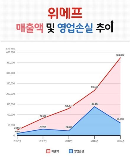 위메프·쿠팡·티몬은 판촉비 급증 등으로 지난 2015년 8천억원대의 대규모 적자를 기록한 바 있다. 특히 위메프의 경우 2015년 매출은 전년대비 72% 성장했지만, 영업적자가 전년대비 391% 급증한 1424억원을 기록했다.