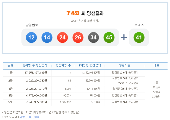 (조세금융신문=온라인뉴스팀) 제749회 나눔로또 당첨번호는 ‘12, 14, 24, 26, 34, 45’, 보너스번호는 ‘41'로 발표됐다.