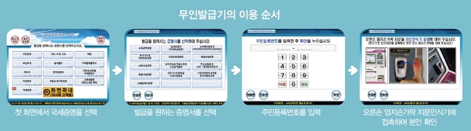 무인민원발급기의 이용은 발급기의 LCD화면 지시에 따라 본인의 해당하는 항목을 손가락으로 터치하여 국세증명을 발급받으면 된다. 화면은 누가 보아도 알기 쉽게 발급을 받을 수 있게 되어 있다.