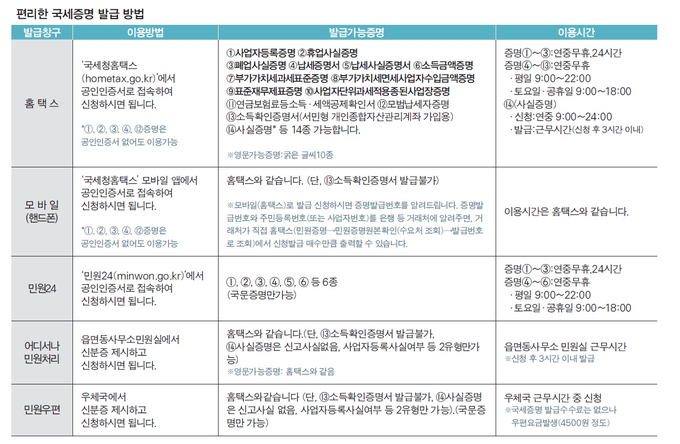 무인민원발급기에서 발급되는 국세증명은 사업자등록증명 등 13종으로 별표의 ‘편리한 국세증명 발급방법’ 표에서 찾아보기 바란다. 무인민원발급기의 설치 장소는 정부민원포털 ‘민원24’에서 확인할 수 있으며, 대부분의 구청이 무인민원발급기를 설치해 놓고 있음을 알 수 있다. 일부 세무서의 민원봉사실에도 무인민원발급기가 설치되어 있으므로, 근로자나 사업자 본인이 민원증명을 받기 위하여 세무서를 방문했다면, 굳이 창구를 이용하지 않고도 무인민원발급기를 이용하여 쉽게 발급받을 수 있으므로, 무인민원발급기가 설치되어 있는지 확인해 보자.