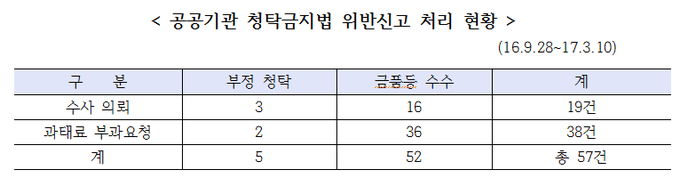 권익위 관계자는 “청탁금지법 시행으로 그동안 공직사회에서 관행적으로 여겨졌던 청탁이나 접대·금품수수 행위가 실제적으로 적발·제재되고 있으며, 현재 조사 중인 사건들도 상당수이므로 향후 수사의뢰나 과태료 부과 사례는 더 증가할 것으로 예상된다”고 밝혔다.