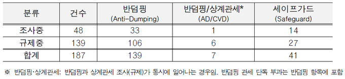 11일 발간된 수입규제 통합지원센터의 ‘수입규제 월간동향’에 따르면 우리나라는 올해 4월 초 기준 30개국으로부터 총 187건의 수입규제를 받고 있는 것으로 조사됐다. 이 중 139건은 규제가 적용 중이며, 48건은 조사가 진행 중이다.