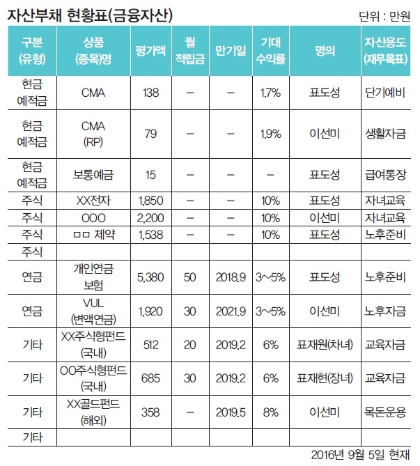 40대 초반으로 두 딸을 두고 있는 표도성 · 이선미(가명) 부부의 ‘자산부채 현황표(금융자산)’를 예로 들어 알아보도록 하자. 금융자산에 대해서는 우선 유형을 현금(예· 적금) · 주식 · 연금 · 채권 · 기타로 구분을 하고 구체적인 상품명이나 투자 종목에 대해 기입한다. 다음으로 오늘 날짜의 잔액(평가액)을 확인해서 기입하고, 매월 고정적으로 적립하는 방식으로 투자하는 항목은 월 적립액에 기입한다. 그리고 만기일을 정확하게 기재하여 만기 이후 발생하는 재무적인 목표에 맞는 추가 운용방안에 대해서 고민하도록 하자.