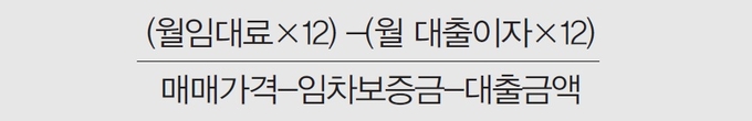 임대 수익률은 예상 월 임대료에서 본인 자금이 투자된 금액을 나누는 것인데 그 공식은 아래와 같다.