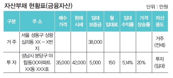 거주 부동산은 현재 평가액과 예상 구입가격 및 본인의 구입 나이를 기입하고 향후 현금성 자산 운용계획을 맞춰서 세우면 되겠고, ‘투자(임대)용 부동산’의 경우에는 평가액과 예상 임대보증금과 임대료 수준을 인근 동일한 혹은 비슷한 평형대의 물건을 기준으로 작성하고 임대수익률을 계산해서 기입하도록 한다.
