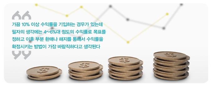 가끔 10% 이상 수익률을 기입하는 경우가 있는데 필자의 생각에는 4~6%대 정도의 수익률로 목표를 정하고 이후 부분 환매나 해지를 통해서 수익률을 확정시키는 방법이 가장 바람직하다고 생각된다.