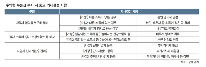또한, 건강보험료 등도 추가되기도 하여 수익성이 떨어질 수 있다는 점도 염두해야 한다. 따라서 취득 전에 누구의 명의로 할 것인지 이에 대해 검토를 잘할 필요가 있다.