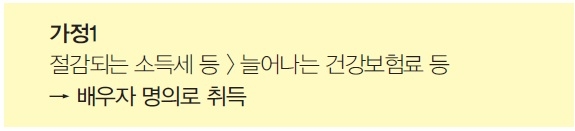 다음은 김씨의 배우자가 소득이 없는 경우다. 일단 김씨 배우자는 임대소득만 발생하므로 김씨 본인 앞으로 취득하는 경우에 비해 소득세를 432만원 정도 절약할 수 있다. 하지만 김씨 배우자 명의로 사업자등록을 하면 지역에서 건강보험료가 별도로 나오게 되며, 소득공제액도 변동될 수 있다. 따라서 배우자의 명의로 하는 경우에는 다음과 같은 원리로 의사결정이 필요하게 된다.