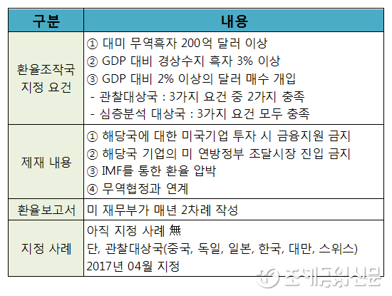 여기서 ▲최근 12개월 동안 대미 무역수지 200억 달러 이상 ▲GDP 대비 경상수지 흑자 비율 3% 이상 ▲GDP대비 2% 이상 달러매수 개입 등 세 가지 조건이 모두 충족하는 경우 ‘환율조작국’, 두 가지 조건만 충족하는 경우 ‘관찰대상국’으로 지정된다.