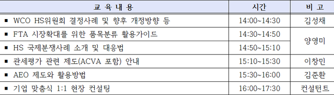 또 WCO HS 위원회 의장인 김성채 관세행정관을 비롯해 품목분류 국제분쟁 전담자 및 관세평가·AEO 관련 전문가들이 강사로 나선다.