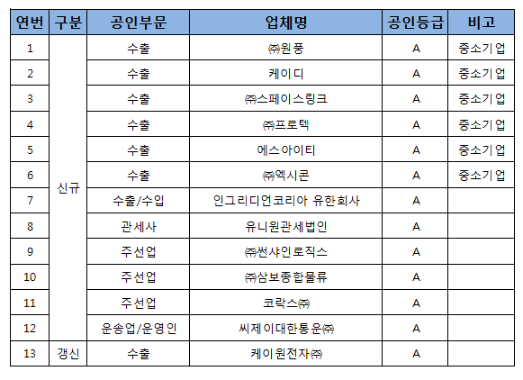 이번 신규 공인된 12개 기업 중 엑시콘 등 6개 중소수출기업은 관세청의 AEO 공인획득 지원 사업을 통해 A등급 공인을 획득했으며, 유효기간이 만료된 케이원전자는 심사 후 재공인을 받았다.