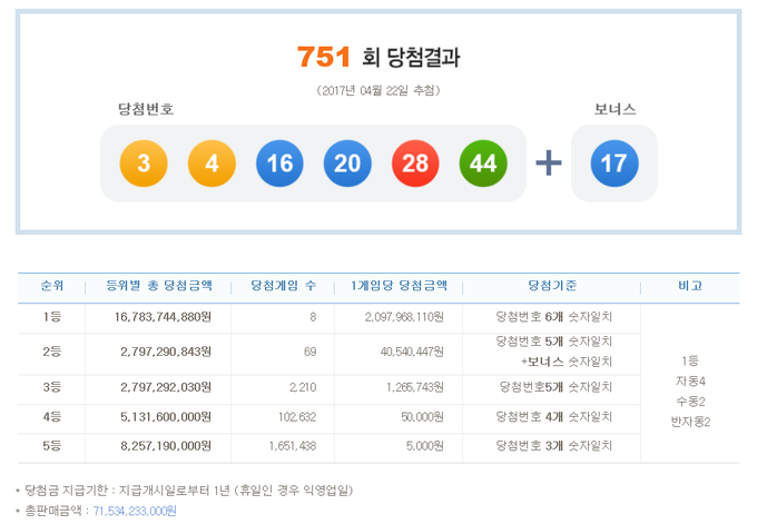 (조세금융신문=온라인뉴스팀) 제751회 나눔로또 당첨번호는 '3, 4, 16, 20, 28, 44' 보너스번호는 ‘17'로 발표됐다.