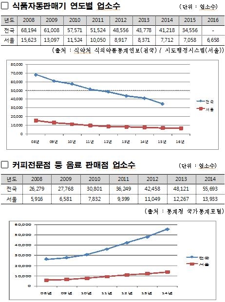 반면 서울시내 커피전문점 등 음료판매점은 2014년 기준 1만3933개로 2008년 5916개 대비 237% 증가했다.