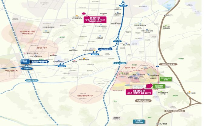 단지 주변의 교통환경은 KTX 천안아산역을 비롯해 경부고속도로, 천안∼논산간고속도로 등이 가까이 위치해 있어 서울 및 수도권 접근성이 용이하다. 천안대로, 남부대로 등 천안의 주요 교통망 이용도 편리해 주요 도심 및 시내·외로 빠른 접근이 가능하다.