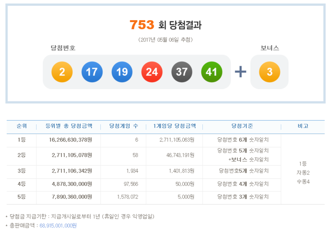(조세금융신문=온라인뉴스팀) 제753회 나눔로또 당첨번호는 '2, 17, 19, 24, 37, 41' 보너스번호는 ‘3'으로 발표됐다.