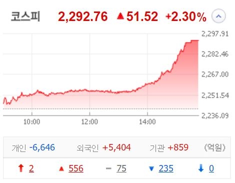 8일 코스피는 전 거래일보다 51.52포인트(2.30%) 오른 2292.76로 마감했다. 지난 4일 2241.42로 최고치를 기록한 데 이어 하루만에 2290선을 넘어서 또 다시 최고치를 갈아치웠다. 대장주 삼성전자와 SK하이닉스는 각각 3.30%, 1.79%의 상승세를 보이며 최고가를 찍었다.