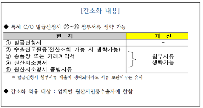 그동안 관세청은 FTA 체결국이 증가함에 따라 FTA 원산지증명서 발급 신청 시 수출기업을 지원하기 위해 ‘원산지인증수출자’에 한해 원산지증명서 첨부서류 제출 간소화 혜택을 부여해왔다.