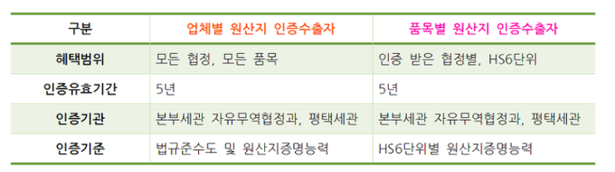 ‘원산지인증수출자’는 ‘업체별 원산지인증수출자’와 ‘품목별 원산지인증수출자’가 있다. 업체별 인증수출자는 인증 후 발효되는 모든 협정 및 신규 수출품목에 대해서도 별도 인증 없이 혜택을 받을 수 있고, 품목별 인증수출자는 인증받은 FTA 협정별·인증 물품에 한해 혜택을 받는다.