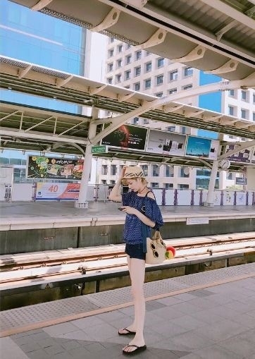 공개된 사진에서 정소민은 더운 태국 날씨에 맞춰 핫팬츠에 샌들을 신고 지하철을 기다리고 있다.