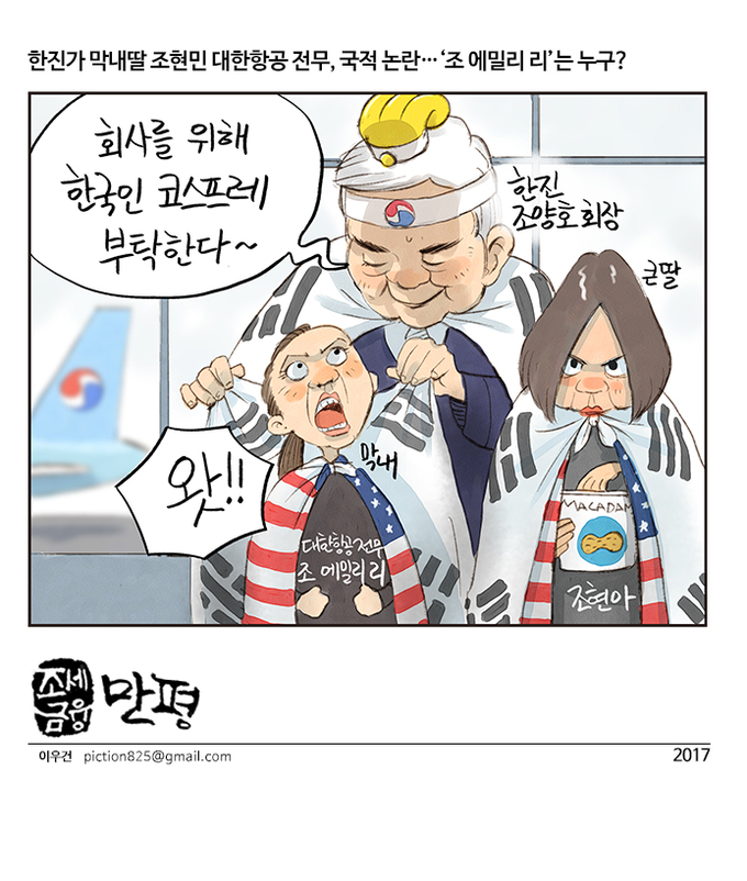[조세금융만평]한진가 막내딸 조현민 대한항공 전무, 국적논란…'조 에밀리리' 누구?