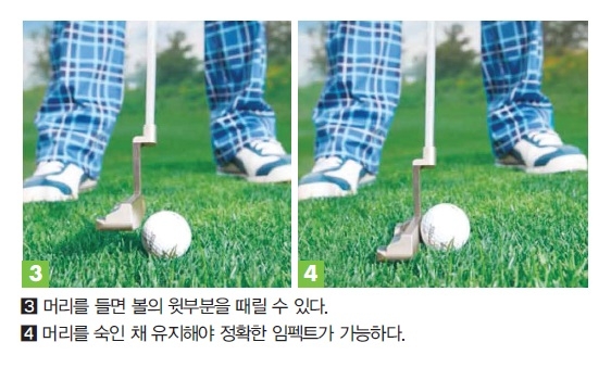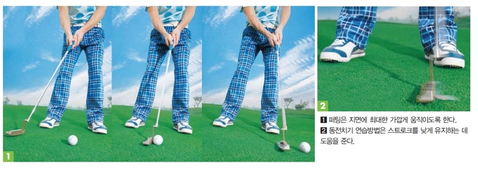 특히 백스윙 보다는 폴로스루 단계에서 낮게 유지하는 데 중점을 둔다(사진1). 그러면 볼을 페이스 중심에 맞히는 게 한결 쉬워지는 것은 물론 임팩트 후에도 일정한 로프트가 유지된다. 이를 위한 연습 방법으로는 동전치기가 있다. 평소 방바닥에 동전을 놓은 후 퍼터로 이를 치는 연습을 하면 효과가 있다(사진2).
