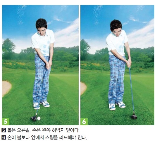 우드는 헤드 바닥이 크고 둥글어서 잔디의 저항을 받지 않으면서 볼과의 견실한 접촉이 가능하다. 퍼터보다 큰 로프트 각도를 가지고 있어 볼을 초기에 살짝 띄워주기도 한다. 요령도 간단하다. 퍼팅 그립을 취하면 되고 조작 능력을 키우기 위해 그립을 짧게 잡는다. 볼은 스탠스 중앙에서 약간 오른쪽에 두고 손은 그보다 앞에 있어야 한다(사진5). 임팩트 이후에도 손이 클럽을 리드한다(사진6). 무엇보다 평소 연습을 통해 거리감을 익혀두는 게 중요하다.