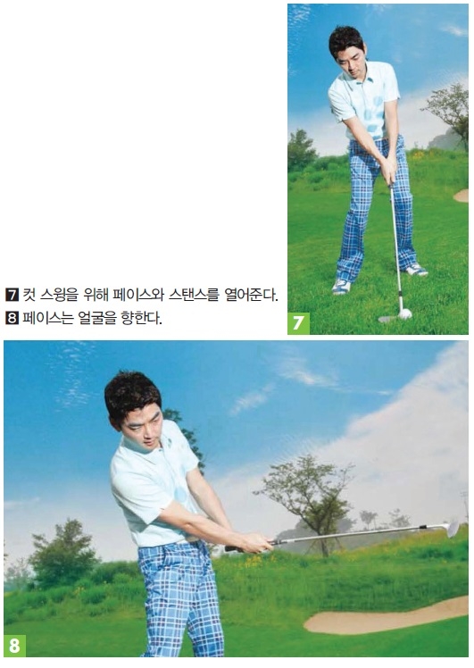 스윙은 그리 어렵지 않다. 일단 로프트 각도가 가장 큰 웨지를 꺼내 들고 페이스를 활짝 열어젖힌다. 물론 페이스를 연 후 그립을 잡아야 한다는 점을 잊지 않도록 한다. 그래야만 임팩트 순간에도 페이스가 닫히지 않고 원상태 그대로 유지된다. 스탠스 역시 열어준다. 안쪽으로 잘라치는 컷스윙을 원활하게 구사할 수 있도록 하기 위해서다(사진7).