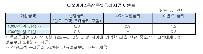 이벤트 기간 중 SC제일은행과 처음 거래하는 중소기업 법인고객이 다모아비즈통장을 개설하고 일별 1000만원 이상의 잔액을 유지할 경우 개설일로부터 3개월 간 연 1.2%의 금리를 받게 된다. 잔액이 1000만원 미만일 경우 연 0.3%의 금리를 적용 받는다. 단 오는 9월 11일 이전에 통장을 해지하면 특별금리를 받을 수 없다.