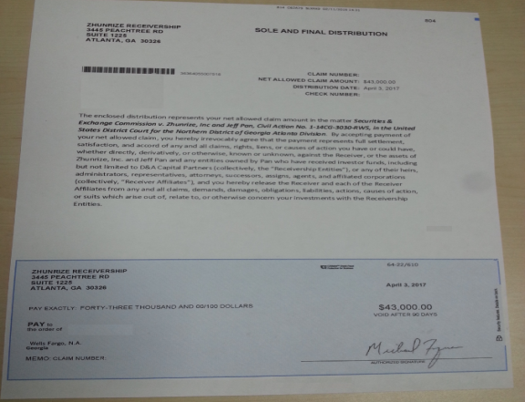 투자금은 썬라이즈 보상대행회사인 BMC그룹이 특송회사인 FEDEX를 통해 개인별 수표로 송부했다.