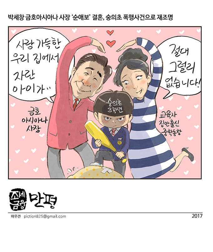 [조세금융만평]박세창 금호아시아나 사장 '순애보' 결혼, 숭의초 폭행사건으로 재조명