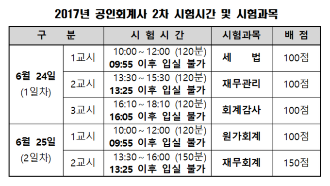 공인회계사 2차시험 과목은 세법, 재무관리, 회계감사, 원가회계, 재무회계 등 총 5과목이며, 이번 2차시험 결과는 오는 8월 25일 발표될 예정이다.