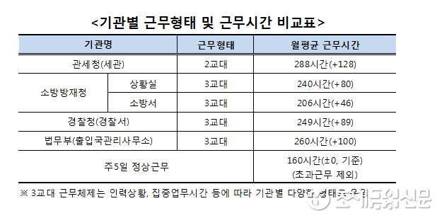 (조세금융신문=신경철 기자) # “일을 하는게 아니라 악으로 버티는 겁니다” 인천세관 공무원 A씨는 한숨을 내쉬었다. A씨는 오전 9시부터 다음날 오전 9시까지 24시간 근무 후 하루를 쉰다. 24시간 2교대 근무자이기 때문이다. A씨의 월 평균 근무시간은 288시간으로 일반 근로자(월 160시간)의 1.8배이다.