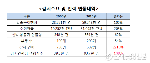 또 다른 관세청 관계자는 “급한 것은 2교대 업무와 월 100시간 이상 초과근무하는 부서의 인력충원”이라며 “하루 빨리 공항 등 감시부서라도 증원될 필요가 있다”고 호소했다.