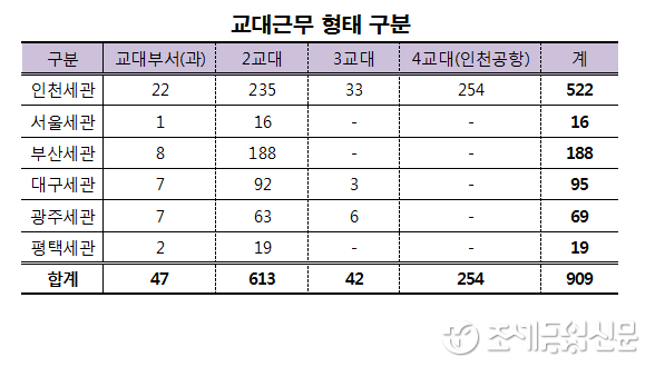 본지가 입수한 ‘관세청 교대근무 현황’ 자료에 따르면 관세청 교대 근무 인원은 총 909명이다.