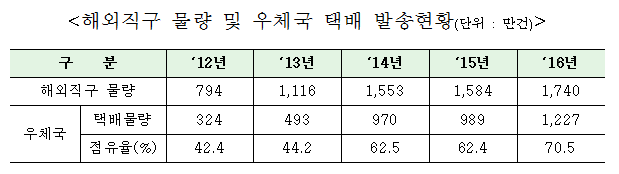 지난해 기준 해외직구 물량은 1740만건이다. 이 중 우체국 택배를 통해 국내로 배송된 건은 1227만건으로 약 70% 점유율을 차지하고 있다.
