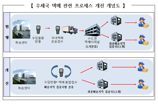 그동안 특송물품은 특송물류센터 화물관리인의 반출확인 후 우체국의 택배 접수절차를 거쳐 수도권 집중국(물류센터)에서 배송 목적지별 분류가 이뤄져 왔다.