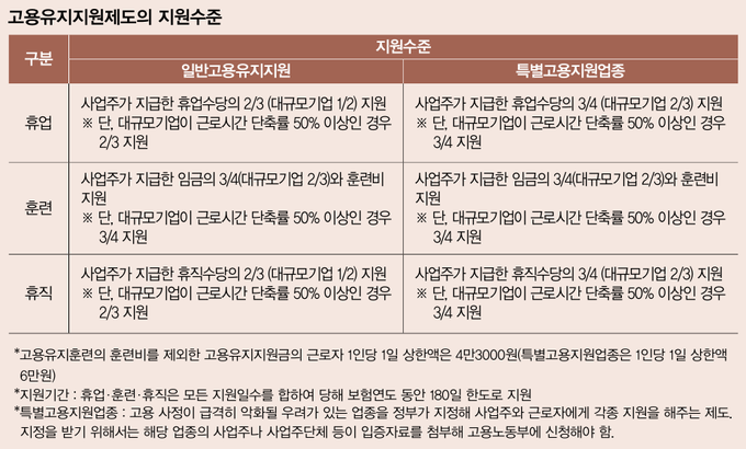 이런 상황에서 적절하게 활용 가능한 고용보험법상의 고용유지지 원제도는 경기의 변동, 산업구조의 변화 등으로 생산량·매출액이 감소하거나 재고량이 증가하는 등의 고용조정이 불가피하게 된 사업주가 근로자를 감원하지 않고 근로시간 조정, 교대제 개편, 휴업훈련, 휴직과 같은 고용유지조치를 실시하고 고용을 유지하는 경우 임금(수당) 및 훈련비를 지원하여 사업주의 경영 부담을 완화하고 근로자의 실직을 예방하도록 지원한다.