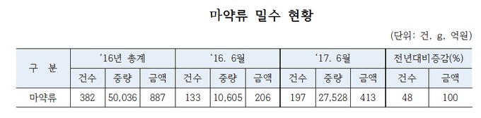 관세청은 올해 상반기 마약류 밀수동향의 주요 특징으로 국내에서 남용되는 대표적인 마약류인 필로폰 압수량이 지난해 동기대비 105% 증가하는 것을 꼽았다. 또 과거에는 필로폰이 주로 중국에서 밀수됐지만 최근에는 미국, 대만, 태국 등으로 다변화되고 있다고 밝혔다.