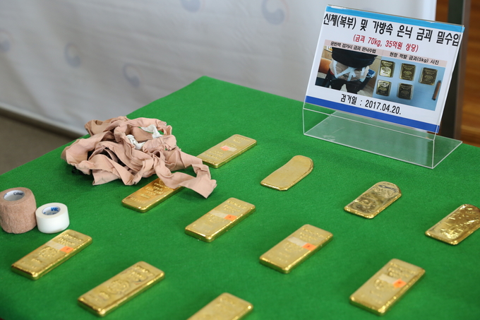 인천본부세관(세관장 노석환)은 올해 3월부터 2개월에 걸쳐 금괴 총 70kg(시가 35억원)을 복부에 부착한 후 테이프로 둘러 붙이는 등의 수법으로 밀수입한 국제 금괴 밀수조직을 적발했다고 13일 밝혔다.